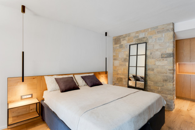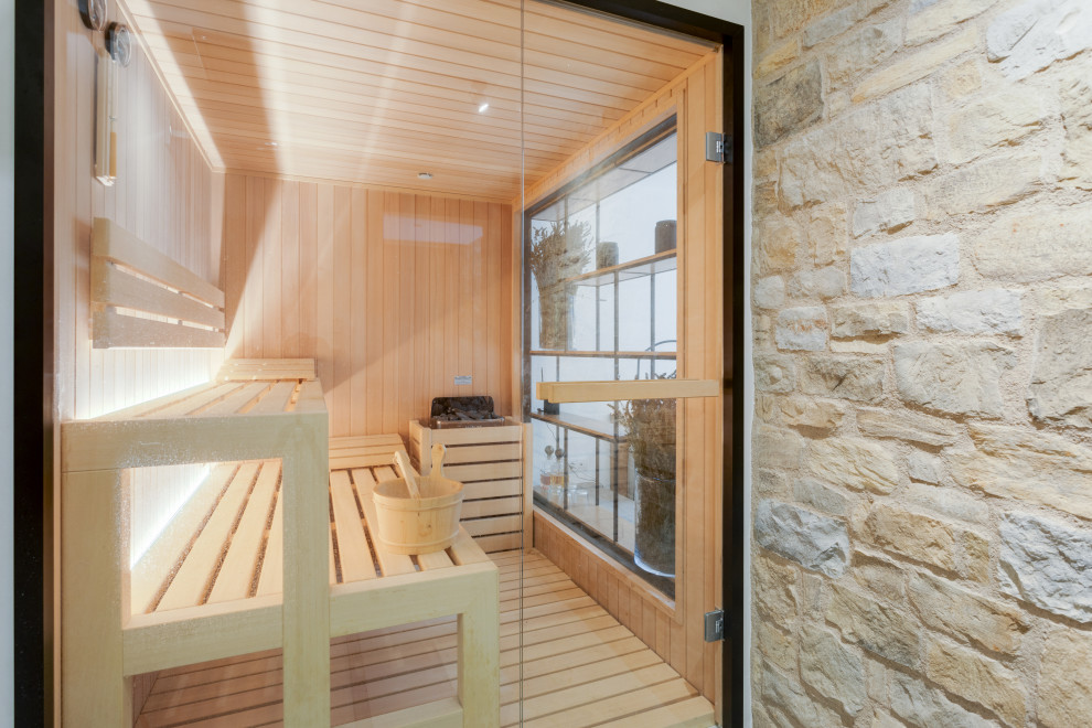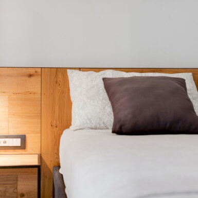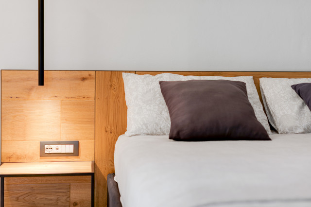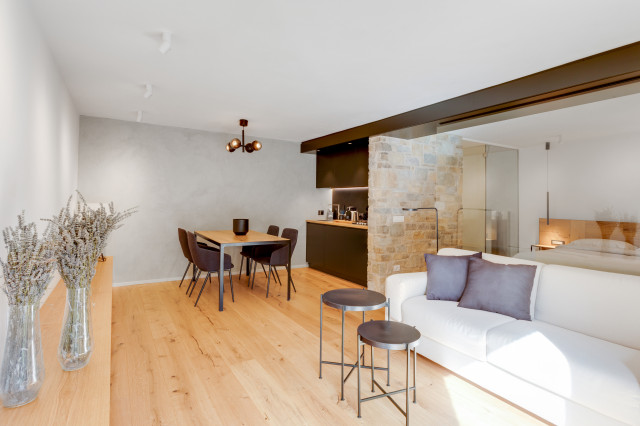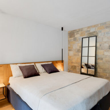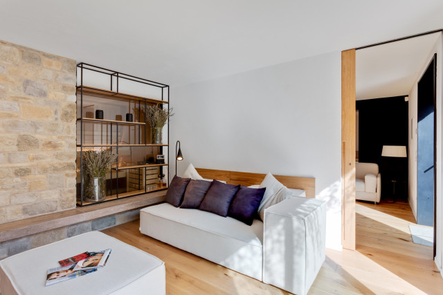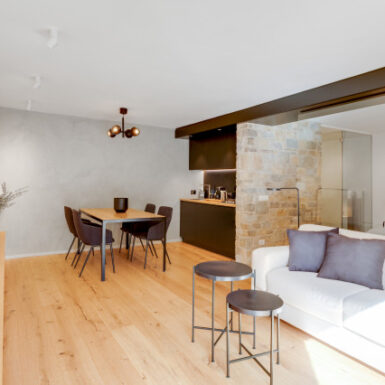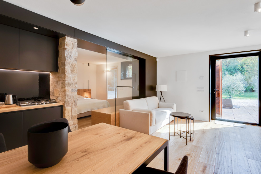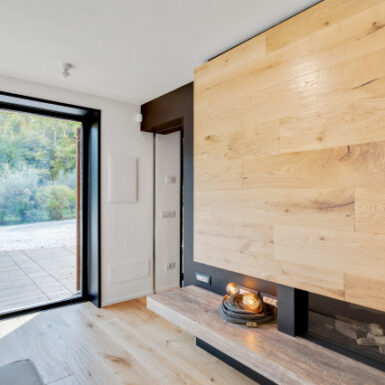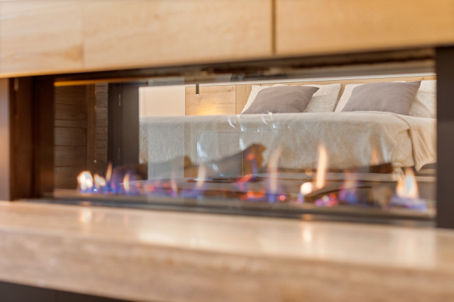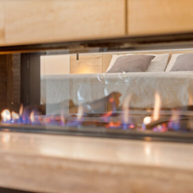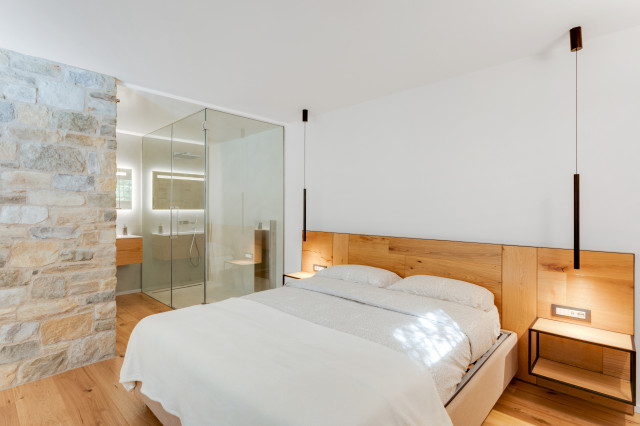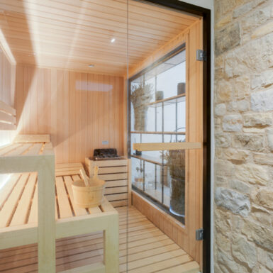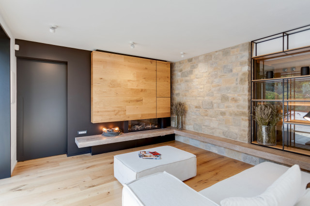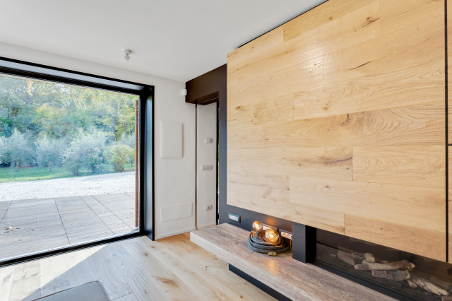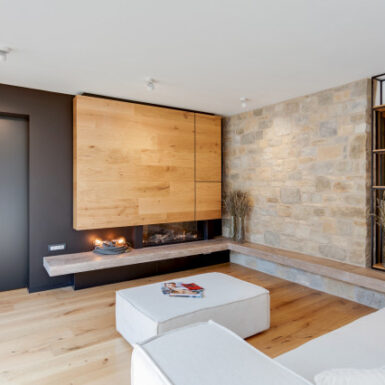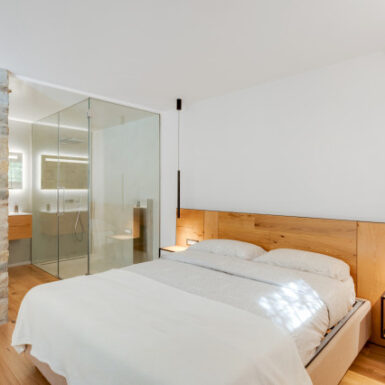 La “trasparenza”, il legno la pietra, la semplicità delle forme lineari definiscono il progetto, composto da 2 camere da letto, una zona living (con camino passante) collegata alla cucina, una zona relax doccia e sauna.