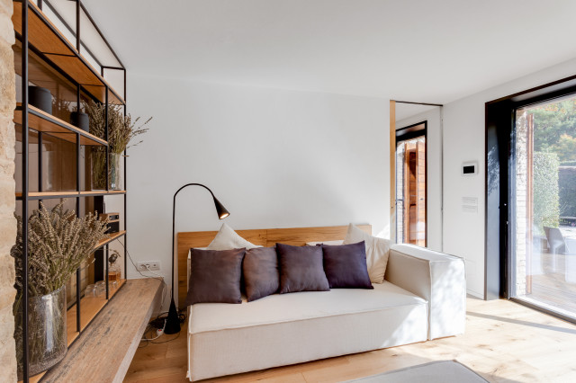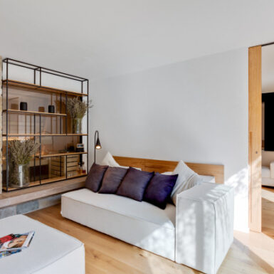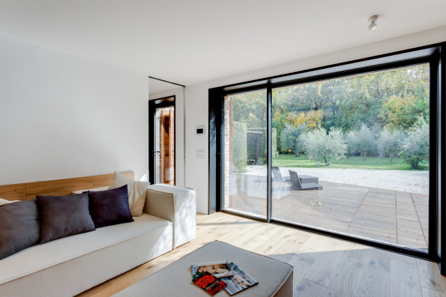 Le pareti di vetro posizionate tra i vari ambienti e le grandi porte scorrevoli a tutt’altezza separano ed allo stesso tempo uniscono senza soluzione di continuità lo spirito ed il paesaggio.